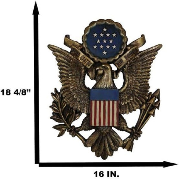Show your patriotism and the American spirit by displaying this wall decor in your room or office space. Featuring the iconic bald eagle and intricate patriotic ribbons, the sculpture is graced by 2 American flags facing the east and west. The Air Force emblem is centered at the forefront of the sculpture.